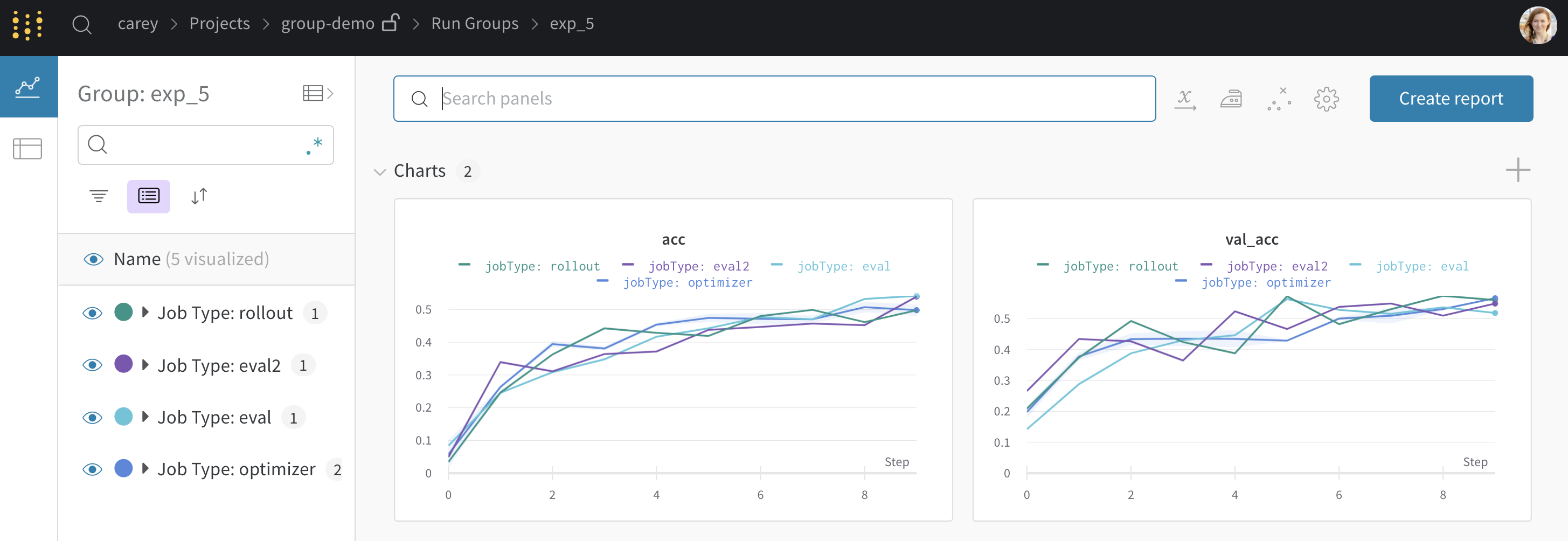 선택적 group 및 job_type 을 wandb.init() 에 전달합니다. 이렇게 하면 각 experiment 에 대한 전용 그룹 페이지가 제공되며, 여기에는 개별 Runs 가 포함됩니다. 예를 들면 다음과 같습니다.wandb.init(group="experiment_1", job_type="eval")